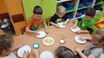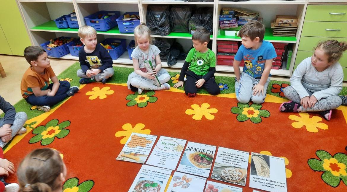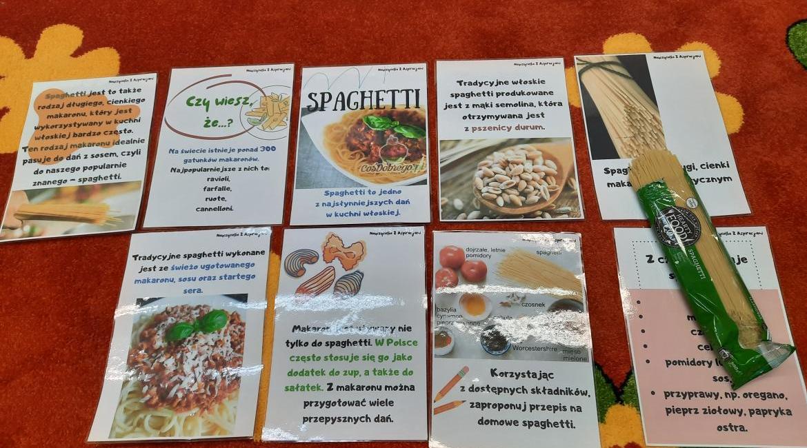Dziś obchodziliśmy „Dzień spaghetti”. Dowiedzieliśmy się z czego powstaje spaghetti, gdzie jest słynne spaghetti, jakie są rodzaje makaronu, jak produkowany jest makaron spaghetti. Następnie wykonaliśmy zadania w kartach pracy oraz pracę plastyczną – własny talerz spaghetti. Celem tego dnia było pokazanie, że jest to potrawa znana i lubiana na całym świecie. Na zakończenie dnia nie mogło oczywiście zabraknąć makaronowego obiadu. Niestety nie było to spaghetti, a zupa makaronowa, która smakowała wyśmienicie!