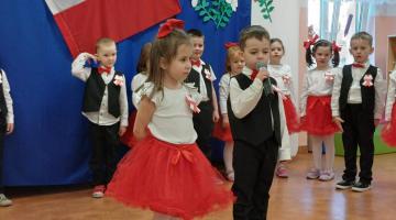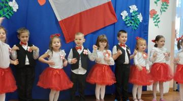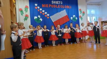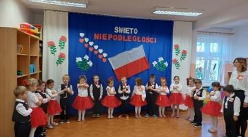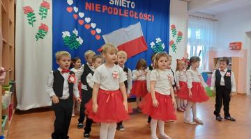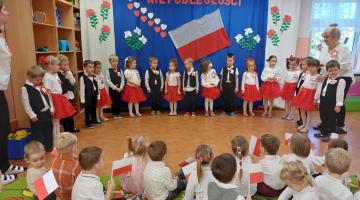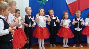 Z okazji Święta Niepodległości Polski dzieci z grupy Żabki przygotowały piękny występ patriotyczny. Przedszkolaki z dumą recytowały wiersze, śpiewały piosenki o ojczyźnie i wspólnie odśpiewały hymn narodowy.